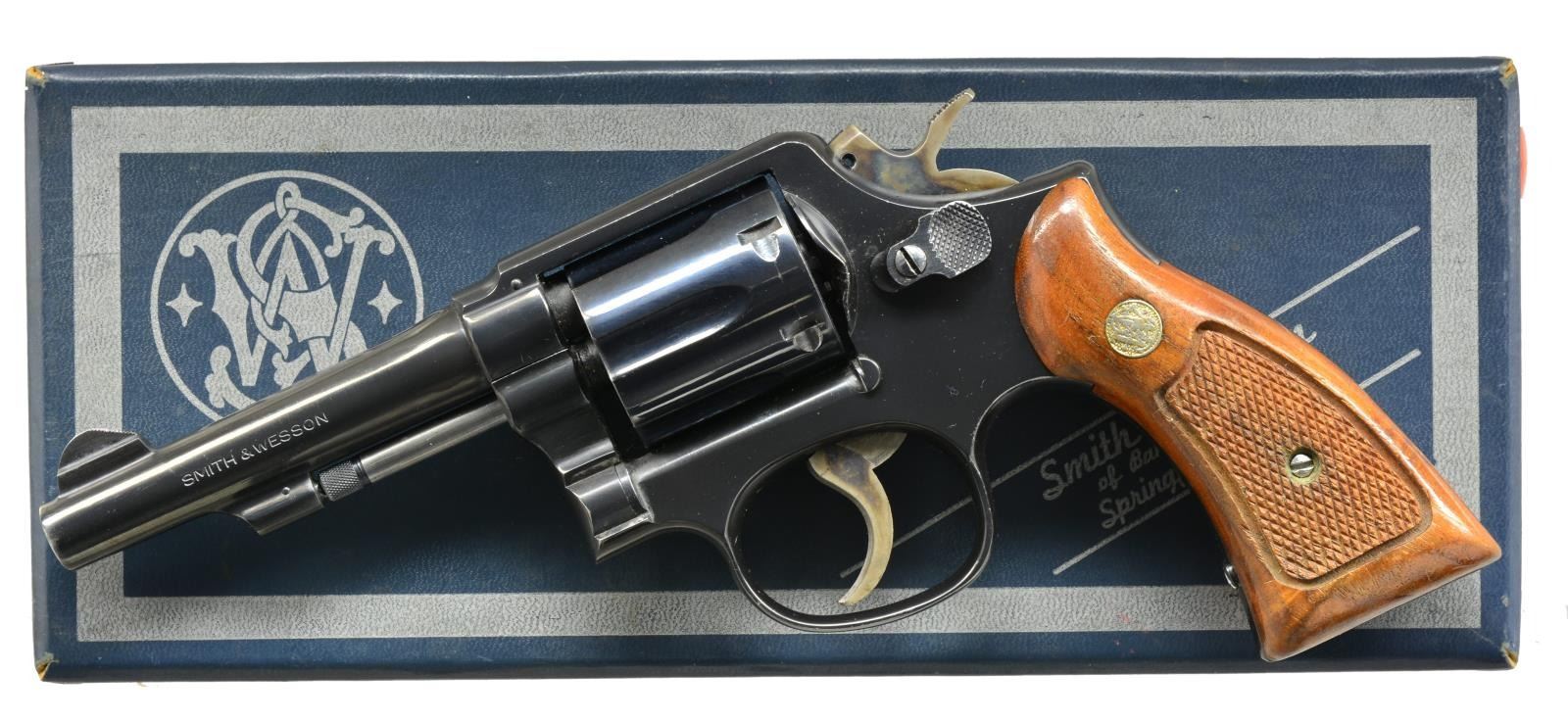 Smith & Wesson Model 10 DA revolver, .38 Special cal., 4” barrel, old reblue finish, checkered wood